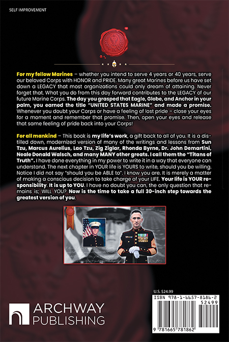 For all mankind – This book is my life’s work, a gift back to all of you. It is a distilled down, modernized version of many of the writings and lessons from Sun Tzu, Marcus Aurelius, Lao Tzu, Zig Ziglar, Rhonda Byrne, Dr, John Demartini, Neale Donald Walsch, and many other greats. I call them the “Titans of Truth”. I have done everything in my power to write it in a way that everyone can understand. The next chapter in your life is YOURS to write, should you be willing. Notice I did not say “should you be ABLE to.” I know you are. It is merely a matter of making a conscious decision to take charge of YOUR life. Your life is YOUR responsibility, it truly is up to you. I have no doubt you can, the only question that remains is – WILL YOU? Now is the time to take a full 30-inch step towards the greatest version of you.